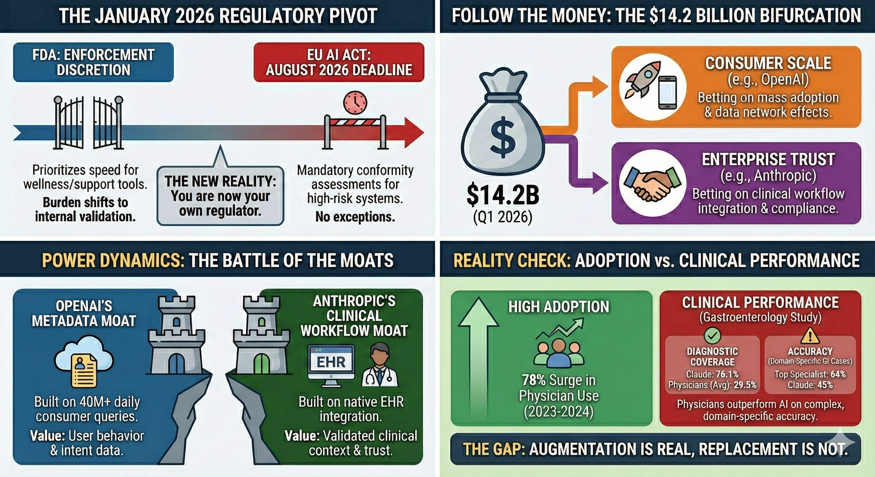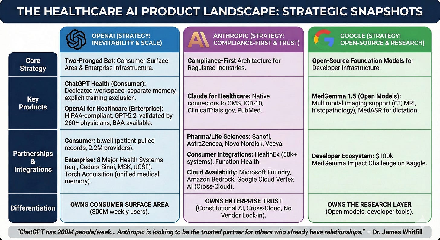 OpenAI owns consumer surface area but lacks enterprise trust. Anthropic owns enterprise trust but lacks consumer scale. Google has research (MedGemma) but not consumer deployment.