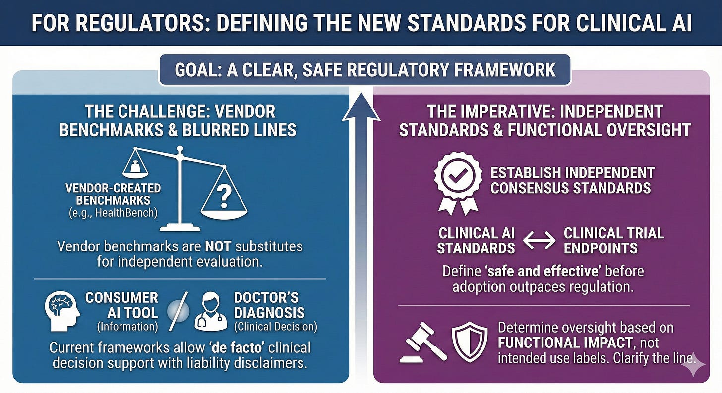 • Require independent validation standards. Vendor-created benchmarks like HealthBench are not substitutes for independent evaluation. Regulators should establish consensus performance standards for clinical AI—analogous to clinical trial endpoints—before market adoption outpaces the ability to define what “safe and effective” means.