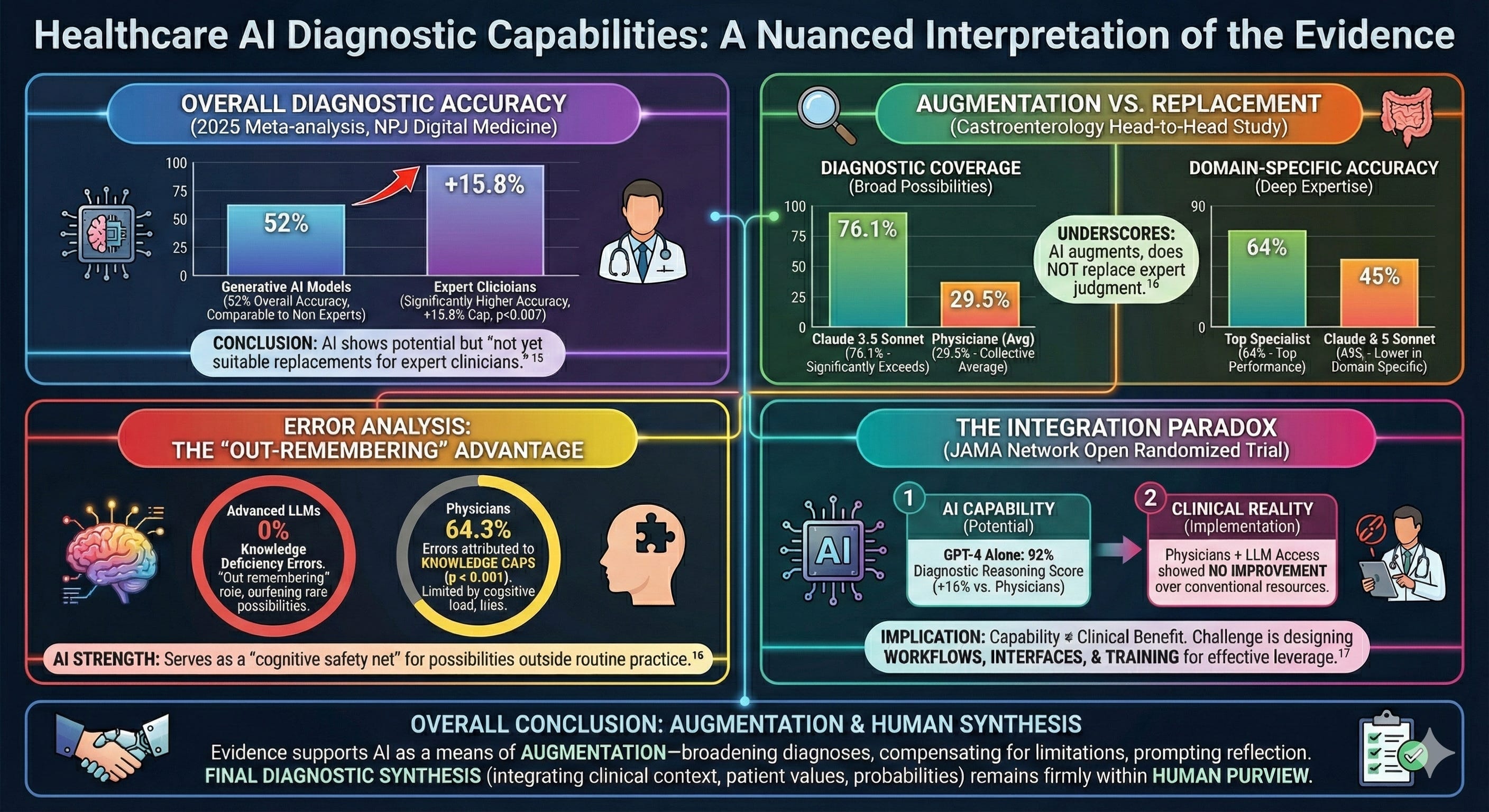📊 Evidence: AI diagnostic accuracy matches non-expert physicians but trails experts by 15.8 percentage points.15 LLMs exhibit zero knowledge deficiency errors versus 64.3% for physicians.16 Yet physicians given LLM access showed no performance improvement over conventional resources.17
