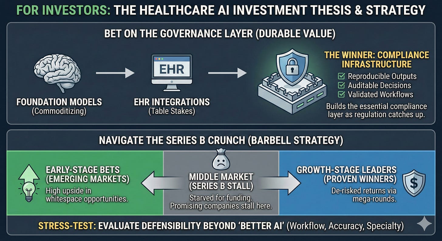 • Bet on the governance layer. Foundation models are commoditizing. EHR integrations are table stakes. The startup that builds reproducible outputs, auditable decisions, and validated workflows—the compliance infrastructure for healthcare AI—will capture durable value as regulation catches up to adoption.