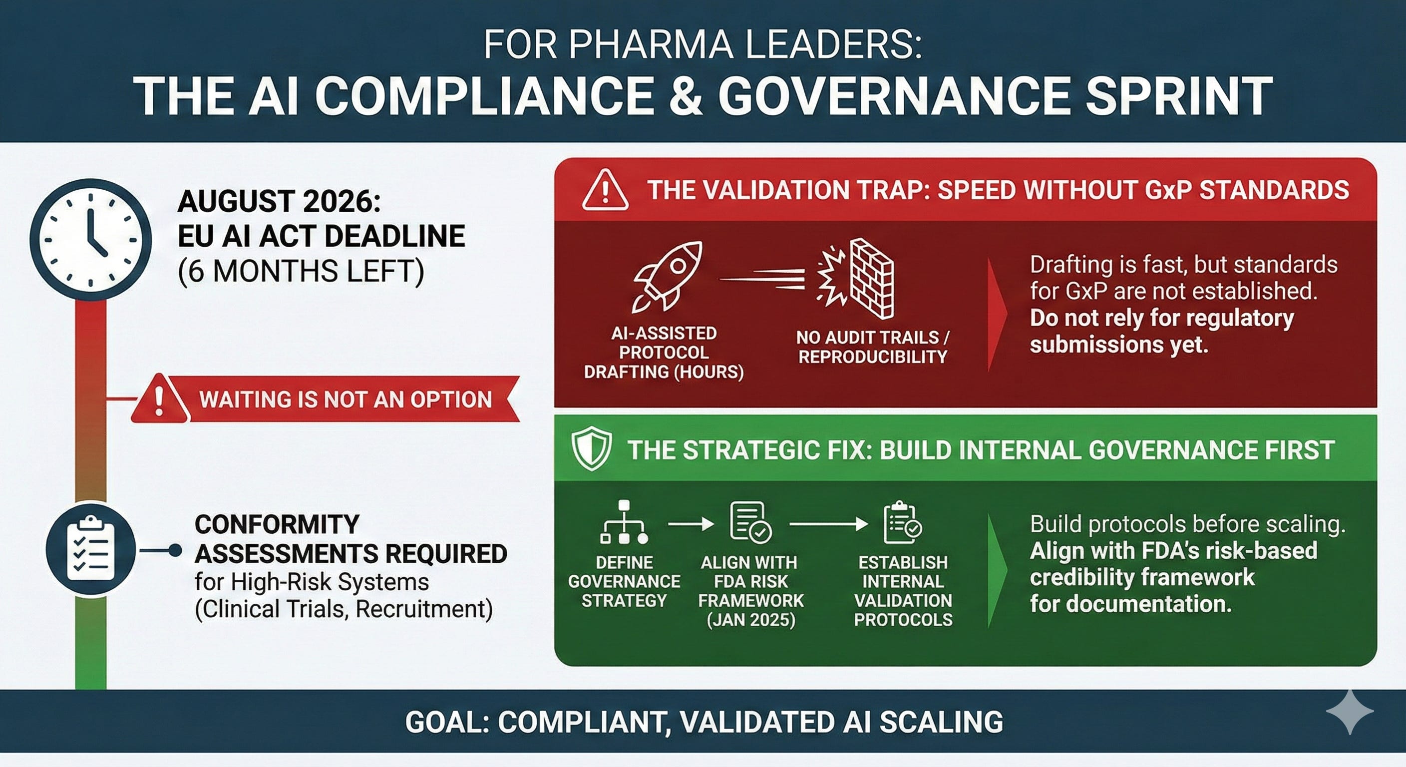• Get ahead of EU AI Act compliance. August 2026 is six months away. High-risk AI systems used in clinical trials, patient recruitment, and regulatory submissions require conformity assessments. Waiting is not an option.
