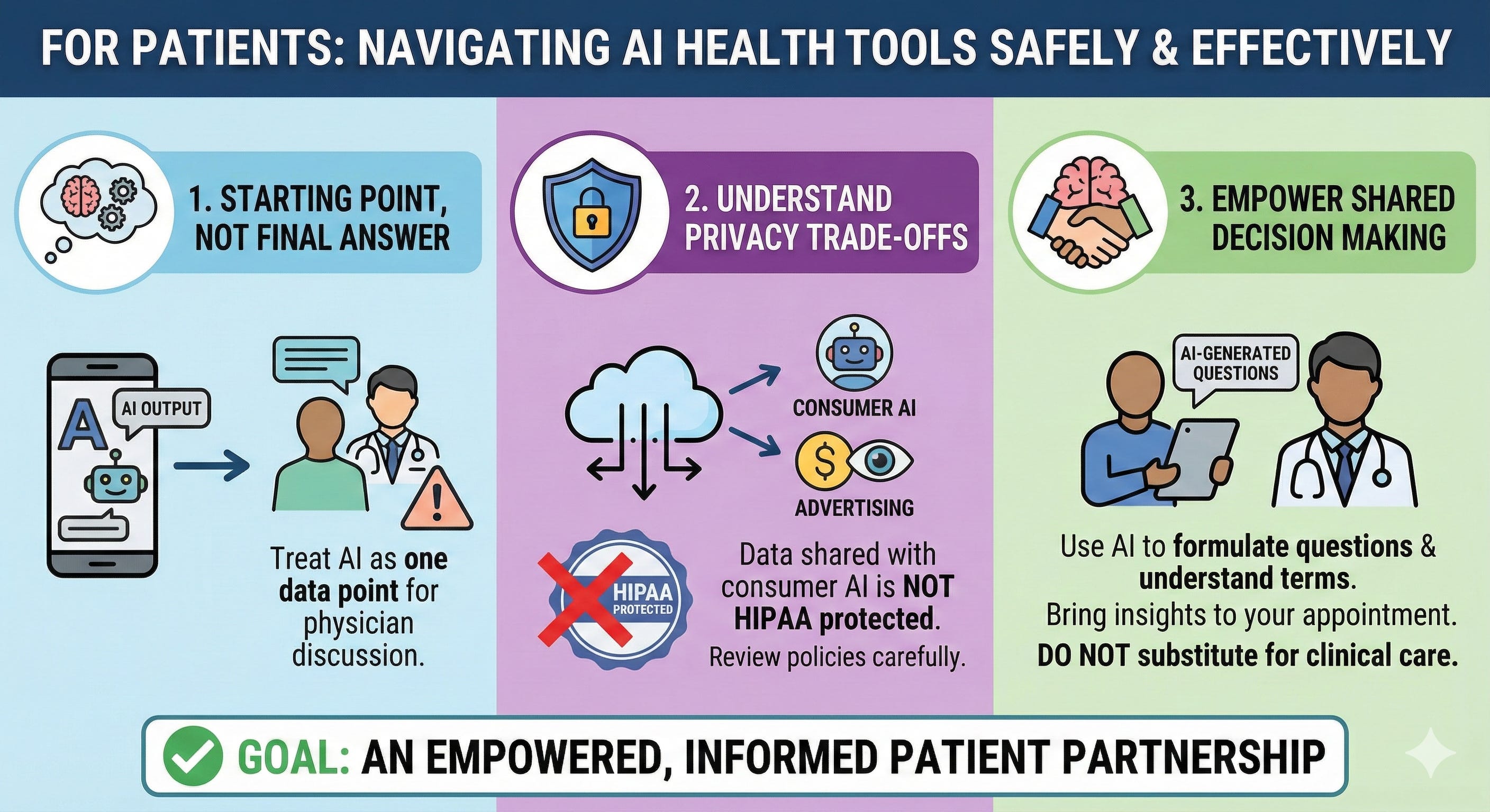 • AI could be the real force multiplier in shared decision making with the physician and empowering patients. AI can help formulate questions and understand medical terminology. Bring your AI-generated questions to the appointment—don’t substitute AI consultation for clinical care.