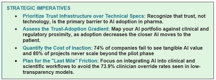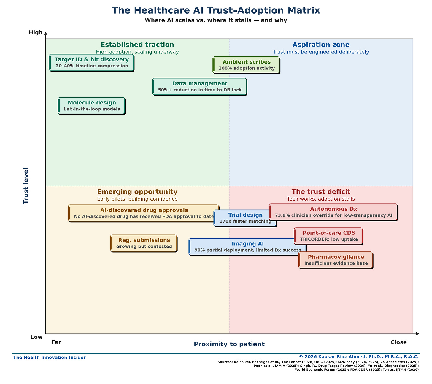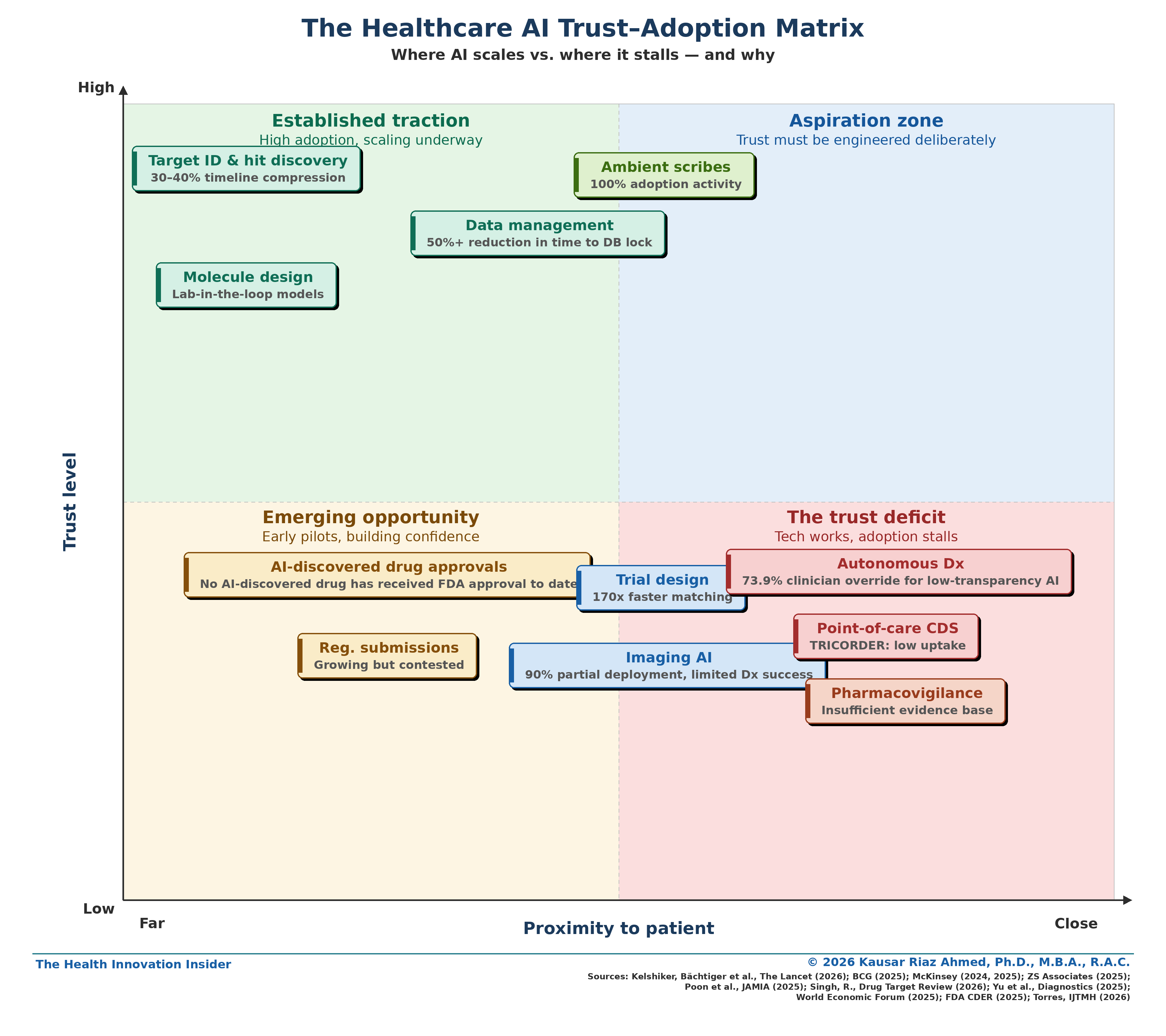 The matrix tells a story every pharma AI leader needs to hear: the technology is not the bottleneck. Trust is. And trust breaks down differently in each quadrant, across different domains, for different reasons.