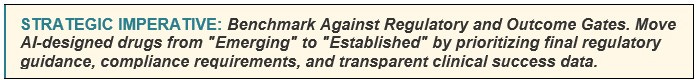 An FDA approval of a genuinely AI-discovered drug. Head-to-head data showing AI-discovered compounds outperforming traditional ones on clinical success rates. Industry adoption of the Pistoia Alliance’s vendor-neutral benchmarking framework (Pistoia Alliance, 2025).