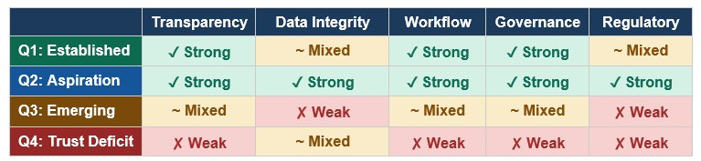 How each quadrant performs across five trust domains (✓ Strong ~ Mixed ✗ Weak)